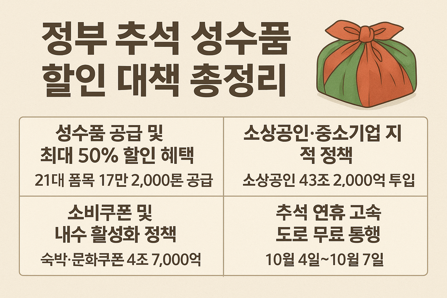 정부는 다가오는 추석을 맞이하여 국민 여러분의 명절 부담을 줄이고, 내수를 활성화하기 위한 다양한 대책을 발표했습니다. 이번 정책의 핵심은 성수품 물가 안정과 최대 50% 할인 혜택을 통한 서민 부담 경감입니다. 더불어 소상공인과 중소기업을 위한 대규모 금융 지원, 소비쿠폰 지급, 고속도로 무료 통행과 같은 생활 밀착형 혜택도 포함되어 있습니다.