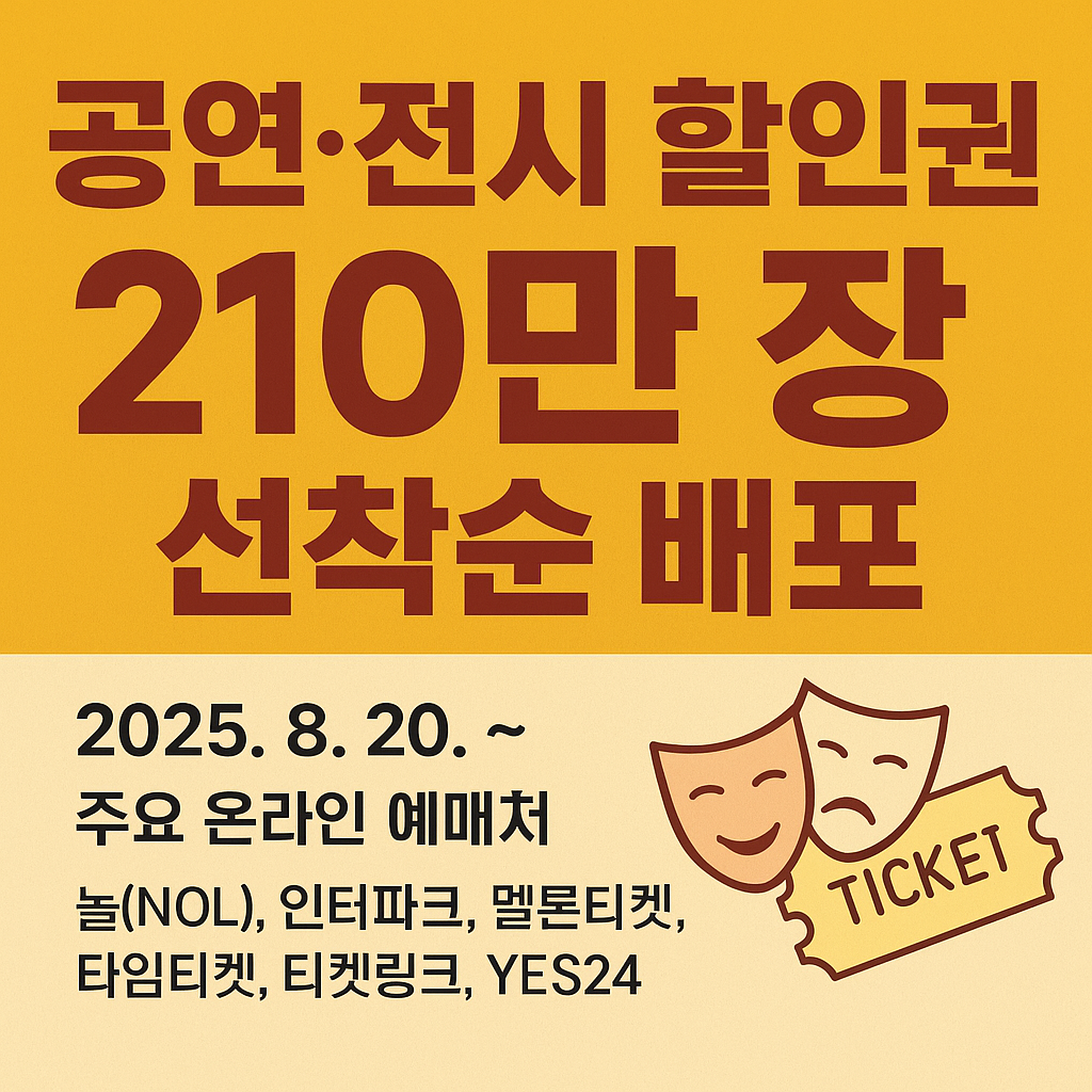 공연 및 전시장 관람을 좋아하는 홍길동씨는 얼마 전 티켓 예매 대행 누리집을 둘러보다 흥미로운 내용을 발견했습니다.대박!!! 2025년 8월 부터 정부가 공연과 전시 관람에 각각 쓸 수 있는 1만 원, 3000원 할인쿠폰을 배포한다는 안내였고 각 쿠폰은 1인당 두 장씩 받을 수 있습니다. 쿠폰을 모두 다 사용할 경우 총 2만 6000원의 할인 혜택을 받을 수 있으니 우리도 지금부터 같이 신청해 볼까요?목차공연·전시 할인권 개요지원 대상 및 주요 혜택신청 방법 및 사용처할인권 사용 시 유의사항비수도권 전용 할인권 안내정리 및 활용 팁 공연·전시 할인권 개요문화체육관광부는 국민들의 문화 생활 향유 기회 확대를 위해 2025년 8월 20일, 총 210만 장의 공연·전시 할인권을 선착순 배포한다고 발표했습니다...